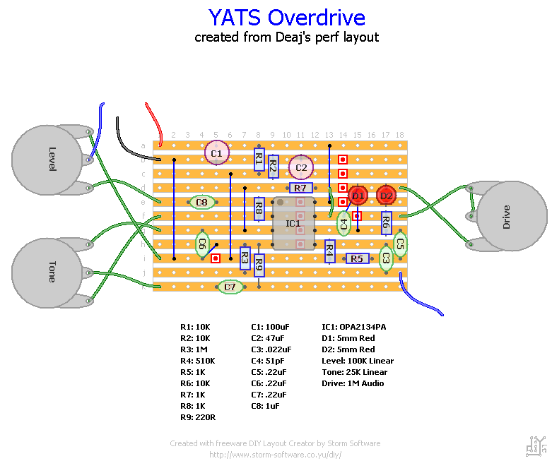 I built the YATS some ago with only two differences from the original: the opamp was a 4558, because I was not able to find a opa2134, and the tone was a 10K resistor in series with a 10K linear pot (to cure the absence of a 20k W taper).