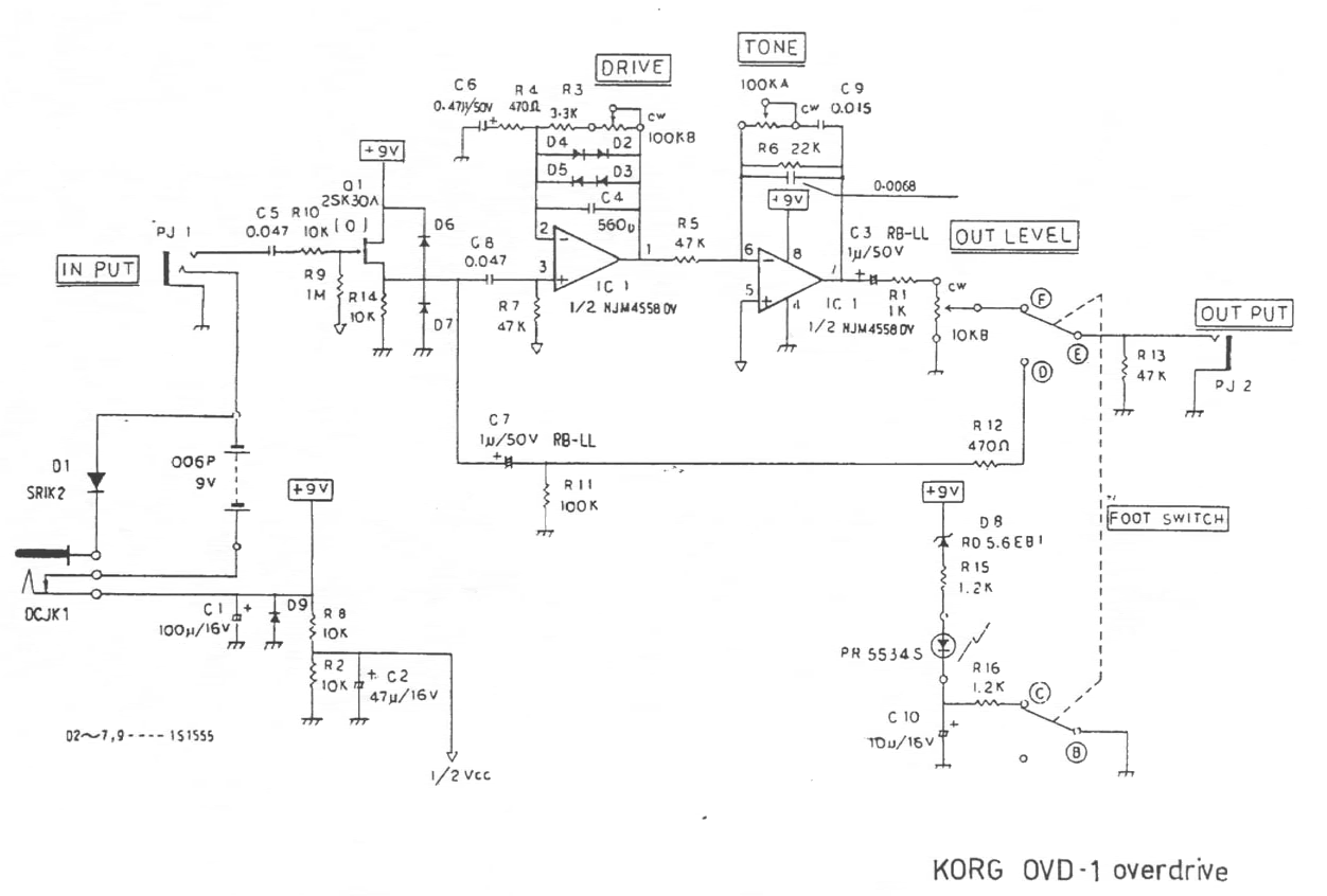 The drive is called Korg "OVD-1 Overdrive", schem can be found via GOOGLE.