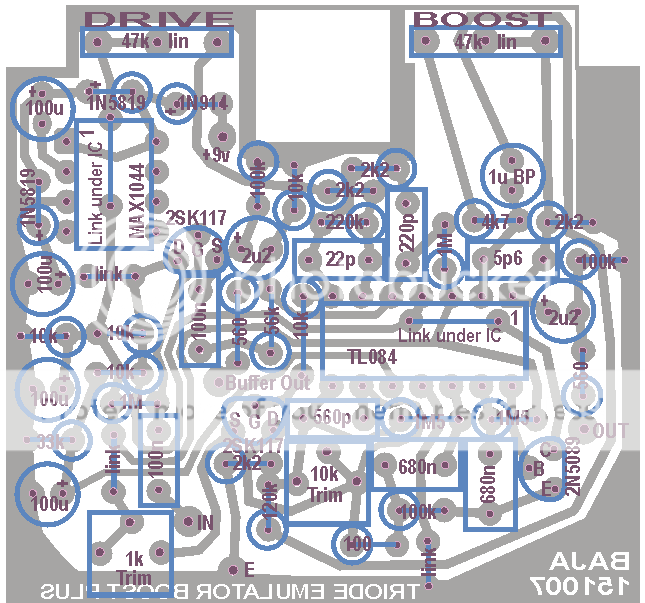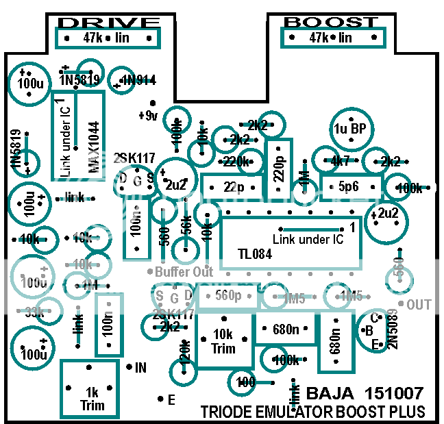 In closing, this is not your average overdrive or distortion pedal - it is not a tubescreamer or fuzz face etc, so do not expect endless smooth sustain from it, but if you build it, I am sure you will find it a very useful and unique sounding pedal, and there are many different distortion characteristics lurking in thesetting of the jfet bias trim pot, not necessarily triode sounding but definately interesting tweaking here.